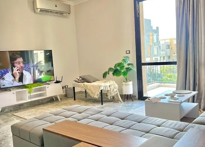 Con un restaurante, el Panoramic View Luxury 2 Beds Hotel Apart - East Town Compound - Sodic - New Cairo - El Cairo se encuentra en el distrito Nuevo Cairo, a poco más de 10 minutos en coche de Life Mall y a una distancia de 1 km de lugares de interés cultural como Picasso East Art Gallery. Este apartamento ofrece una terraza y vistas al jardín.